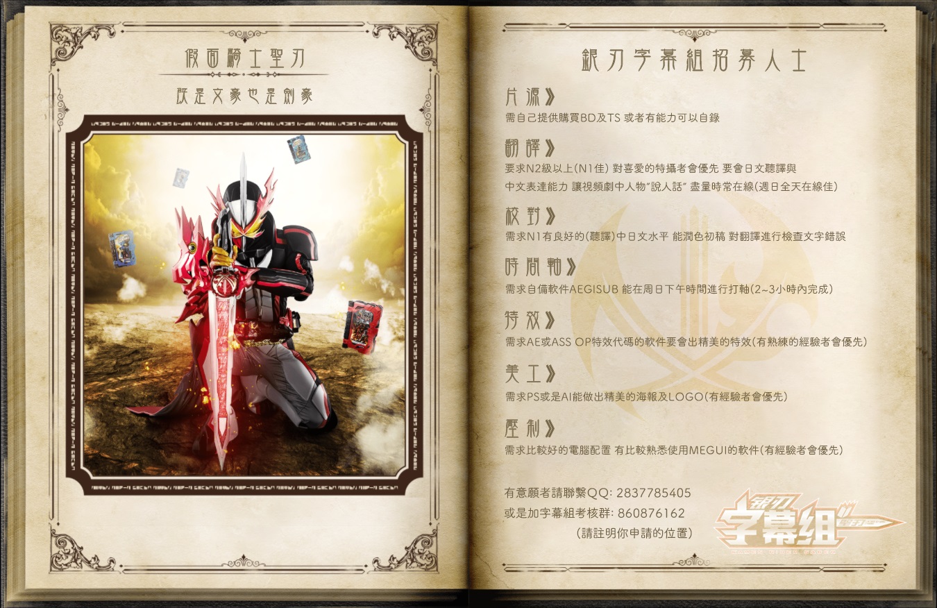 銀刃現正招募 特效、翻譯、校對、時間軸、壓制等成員