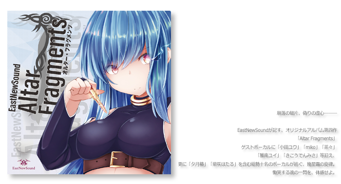 トラックリスト◆01:secret instrument #Vocal:茶々 Compose:MARIN Lyric:くまりす◆02:脳内浮遊、制御不能 #Vocal:花咲あんな Compose:Masayoshi Minoshima Lyric:花咲あんな◆03:Victim #Vocal:紫咲ほたる Compose:きりん Lyric:くまりす◆04:splash #Vocal:夕月椿 Compose:溝口ゆうま [M.H.S] Lyric:夕月椿◆05:硝子の小瓶 #Vocal:小田ユウ Compose:MARIN Lyric:鍵山れいら◆06:時雨 #Vocal:miko [Alternative ending] Compose:b-UMB Lyric:くまりす◆07:Special Colors!! #Vocal:葉月ゆら Compose:nmk Lyric:鍵山れいら◆08:INFINITY #Vocal:きこうでんみさ Compose:黒鳥Lyric:小田ユウ◆09:DEEP FOREST #Vocal:吉田沙織 Compose:きりん Lyric:鍵山れいら◆10:ocean planet #Vocal:雅南ユイ(YUIMINO+) Compose:雅南ユイ(YUIMINO+)v.s. 黒鳥 Lyric:くまりすSTAFF・Vocal: 夕月椿 紫咲ほたる 花咲あんな miko [Alternative ending] 茶々 葉月ゆら 吉田沙織 きこうでんみさ 雅南ユイ 小田ユウ ・Composer: 黒鳥 きりん MARIN Masayoshi Minoshima 溝口ゆうま [M.H.S] nmk b-UMB 雅南ユイ・Lyricist: くまりす 鍵山れいら 夕月椿 紫咲ほたる 花咲あんな・Illust: 春兎・JacketDesign: LMY頒布2016/08/13日(土)コミックマーケット90 2日目西a52b「EastNewSound」ブースにて頒布!